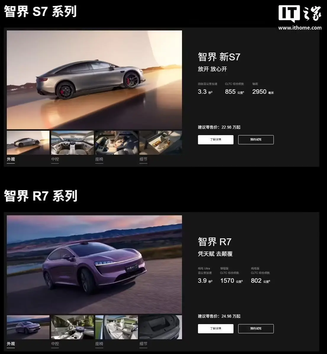 今年 5 月 27 日,智界汽车累计交付量突破 10 万辆。智界汽车已推出智界 S7 系列、智界 R7 系列,包括智界新 S7、智界新 S7 Ultra 运动版、智界 R7 增程版、智界 R7 纯电版等。
