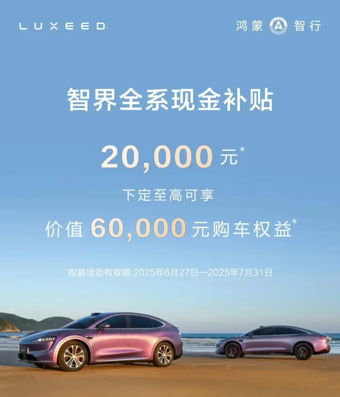 6 月 26 日消息,鸿蒙智行公众号今日宣布智界全系启动补贴,立减 20000 元现金,6 月 27 日起,下定至高可享价值 60000 元购车权益。权益活动有效期为 6 月 27 日至 7 月 31 日。