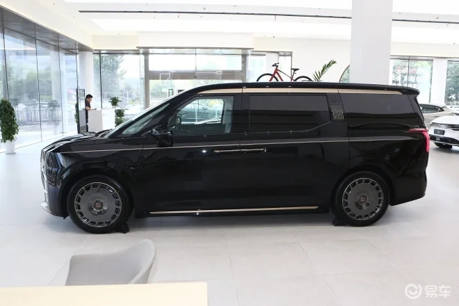 外观方面,极氪009光辉典藏版在外观设计上采用了极具辨识度的黑金配色方案,将低调的奢华演绎到极致,新车采用全黑色车身,搭配金色的车头标识、车身侧面饰条和门把手,形成强烈的视觉对比。