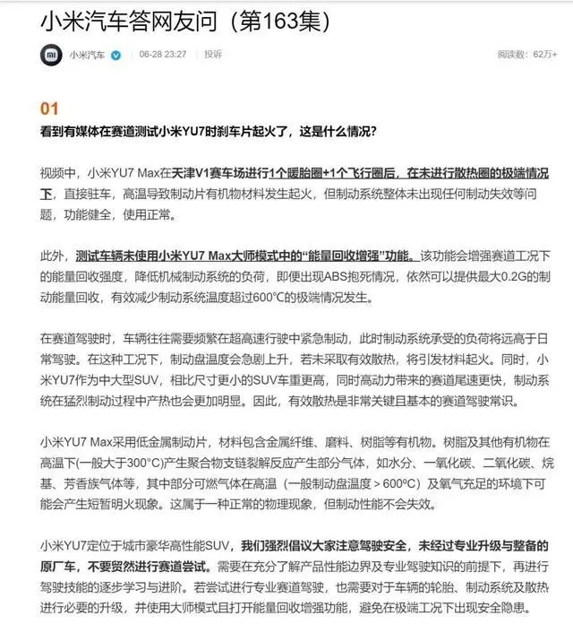 6月28日,小米汽车回应此次刹车起火事件。官方表示:在测试视频中,小米YU7 Max在天津V1赛车场进行1个暖胎圈+1个飞行圈后,在未进行散热圈的极端情况下,直接驻车,高温导致制动片有机物材料发生起火,但制动系统整体未出现任何制动失效等问题,功能健全,使用正常。