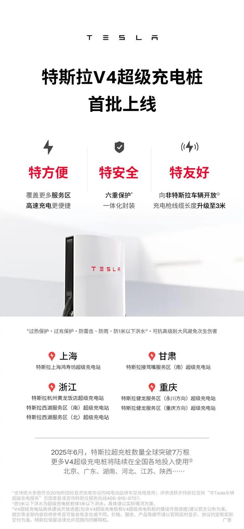 截至目前,特斯拉超级充电桩全球已突破7万根,充电网络布局100%覆盖中国大陆省会城市及直辖市,更多V4超级充电桩将陆续在全国各地投入使用。