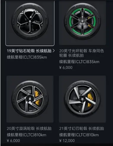 外观除了车漆颜色,轮毂选择上,小米 YU7 提供了足足 7 款样式的轮毂可供选择,尺寸覆盖 19 - 21 英寸。从实际表现来看,19寸免费轮毂对于YU7来说着实寒酸了些,6000元增配到20寸轮毂或12000元增配到21寸轮毂对于YU7颜值的提升可谓十分必要。