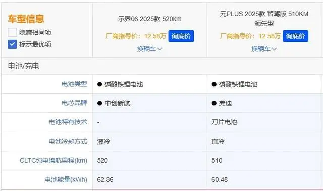 在大家都关心的电动车续航方面,这台示界06的CLTC纯电续航里程为520km,搭载62.3kWh的磷酸铁锂电池(中创新航)。作为对比,同样售价12.58万元的元PLUS 2025款 智驾版 510km领先型,它的CLTC纯电续航则只有510km,而电池容量为60.48kWh(弗迪电池)。