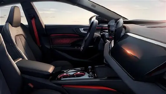 侧面溜背式车顶线条延伸至车尾,配上20英寸运动轮毂、无框车门以及隐藏式门把手等设计,整体兼顾了运动感与空气动力学性能。车身尺寸方面,新车长宽高分别为4903mm*1883mm*1427mm,轴距为2922mm。车尾采用贯穿式尾灯设计,并配有小鸭尾式扰流板,进一步凸显了车辆的运动气息。