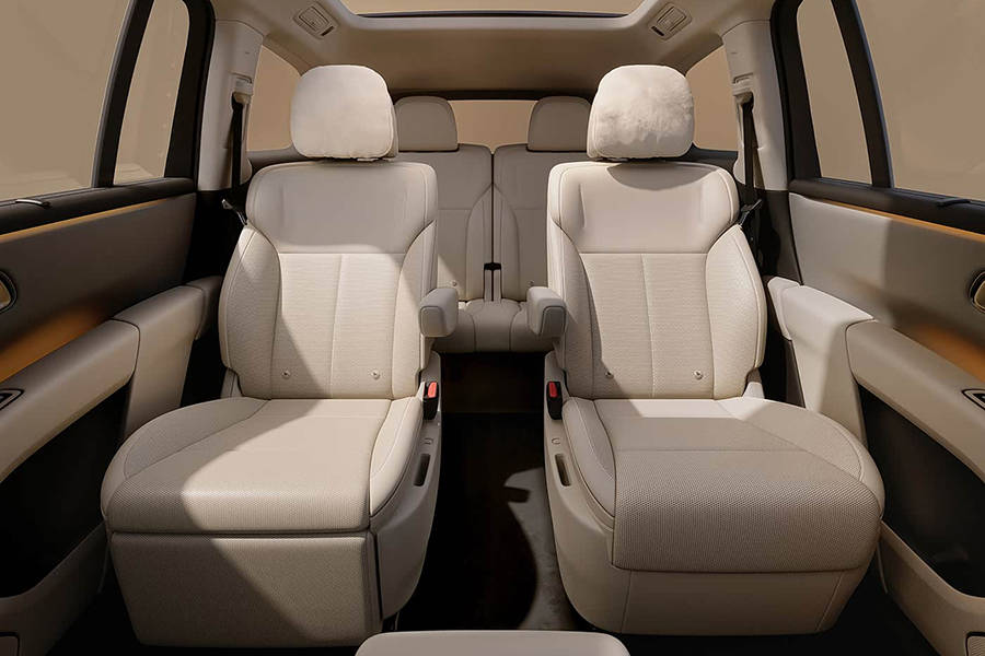 从第二排座椅图片来看,其采用2+2+2的座椅布局,并配备车内氛围灯、全景天幕以及疑似二排隐私帘,同时,其门板处设有尺寸较大的储物槽,满足二三排乘客的储物需求。