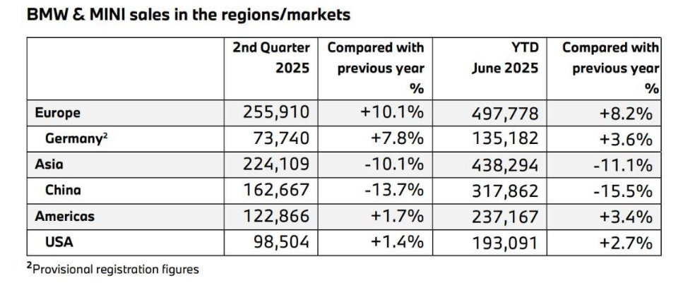 官方数据显示,2025年上半年,宝马在欧洲市场、美国市场等均实现了不同程度的销量上涨态势。