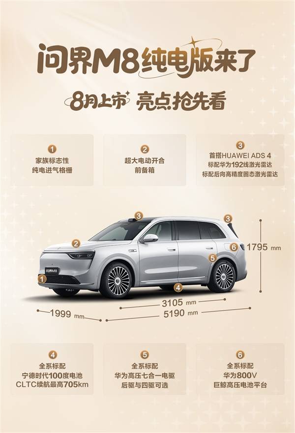 动力上,新车首发搭载华为高压七合一电驱,具有更小体积、更低重量、更高效率、更低噪音等优势,提供后驱和四驱两种动力总成。续航方面,车辆全系标配宁德时代100度电池,基于华为巨鲸800V高压电池平台打造,CLTC综合续航里程最高可达705km。
