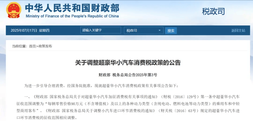 近日,《财政部国家税务总局关于调整超豪华小汽车消费税政策的公告》发布:自7月20日起,零售环节消费税征收门槛由不含增值税130万元/辆下调至90万元/辆,同时首次把纯电、燃料电池等所有动力形式的乘用车及中轻型商用客车纳入征税范围,税率维持10%不变。消息落地后,业内普遍认为,90万—130万元价格带将成为“重灾区”,多个热销车型恐遭“灭顶之灾”。