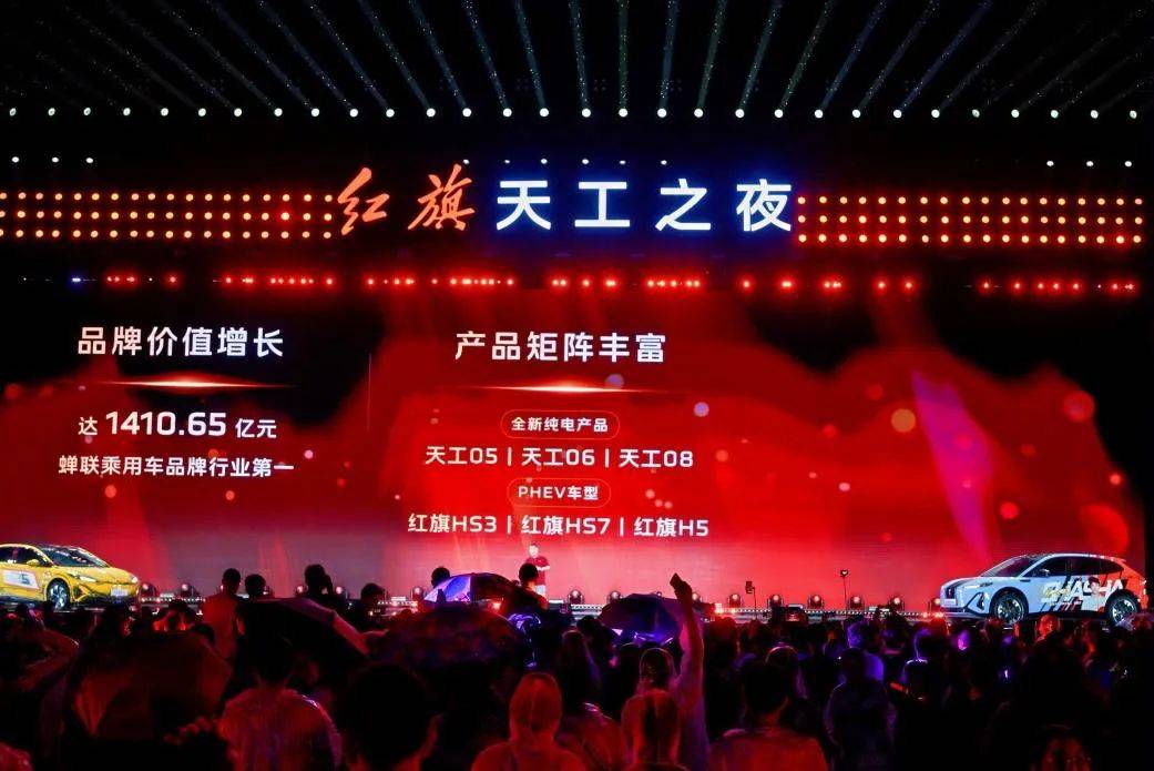 盛典上,中国一汽总经理助理、红旗品牌运营委员会副总裁柳长庆发布了七重“宠粉好礼”:膨胀金礼方面,新用户于红旗官方抖音直播间购入1000元抵7000元购车券,限时享7倍膨胀;金融无忧礼提供购车享至高5年0息,或0首付+5年超低利息的方案;置换焕新礼中,红旗车主置换新车至高享35000元补贴(同享国/地补),增换购天工产品额外赠1000元积分;充电无忧礼为新能源用户提供7kW充电桩及安装服务,或1000元充电卡券+1500元充电桩抵扣券(二选一);旗仕推荐礼设置车主成功转介新车主至高获1000元/台积分激励;智联好物礼推出红旗智联APP限时百种好物7.17折优惠;旗仕潮玩礼则针对不同车型定制福利,购天工05/06享5000元青春潮改基金,智选版免费升级至高16000元尊享配置;购天工08/EH7赠5000元旅行基金+2000元定金至高抵30000元尾款,且以上四款车型均赠青春野趣套装。