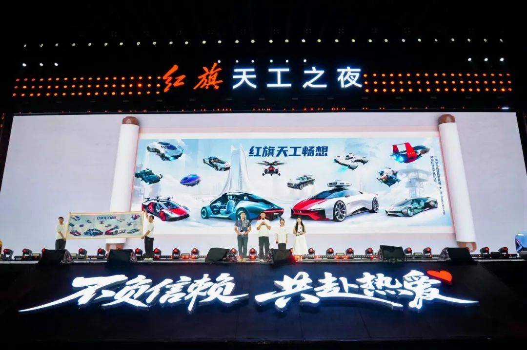 家年华之夜,30名红旗梦想自强班学子来到现场,6名即将步入大学的学子代表登台,向中国一汽党委副书记梁贵友赠送AI创作长卷《我的红旗天工畅想》。当国车底蕴遇见Z世代的数字表达,红旗品牌成为承载青春梦想的“画布”,勾勒出新一代心中的民族汽车工业蓝图。