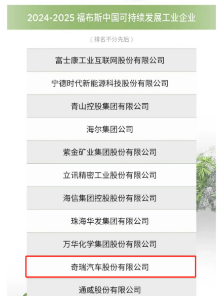 图为奇瑞登榜2024-2025福布斯中国可持续发展工业企业榜