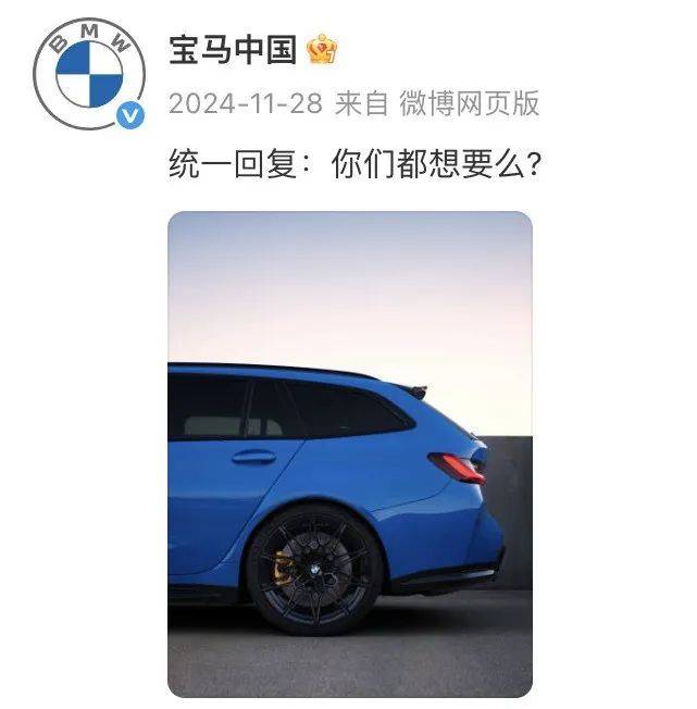 值得一提的是,这款“破圈”主角的兄弟车型——宝马M3旅行车雷霆版,确认将引进中国市场,预计在今年11月份正式发布,并采用限量形式销售,据了解,目前宝马经销商已经开始收集订单。