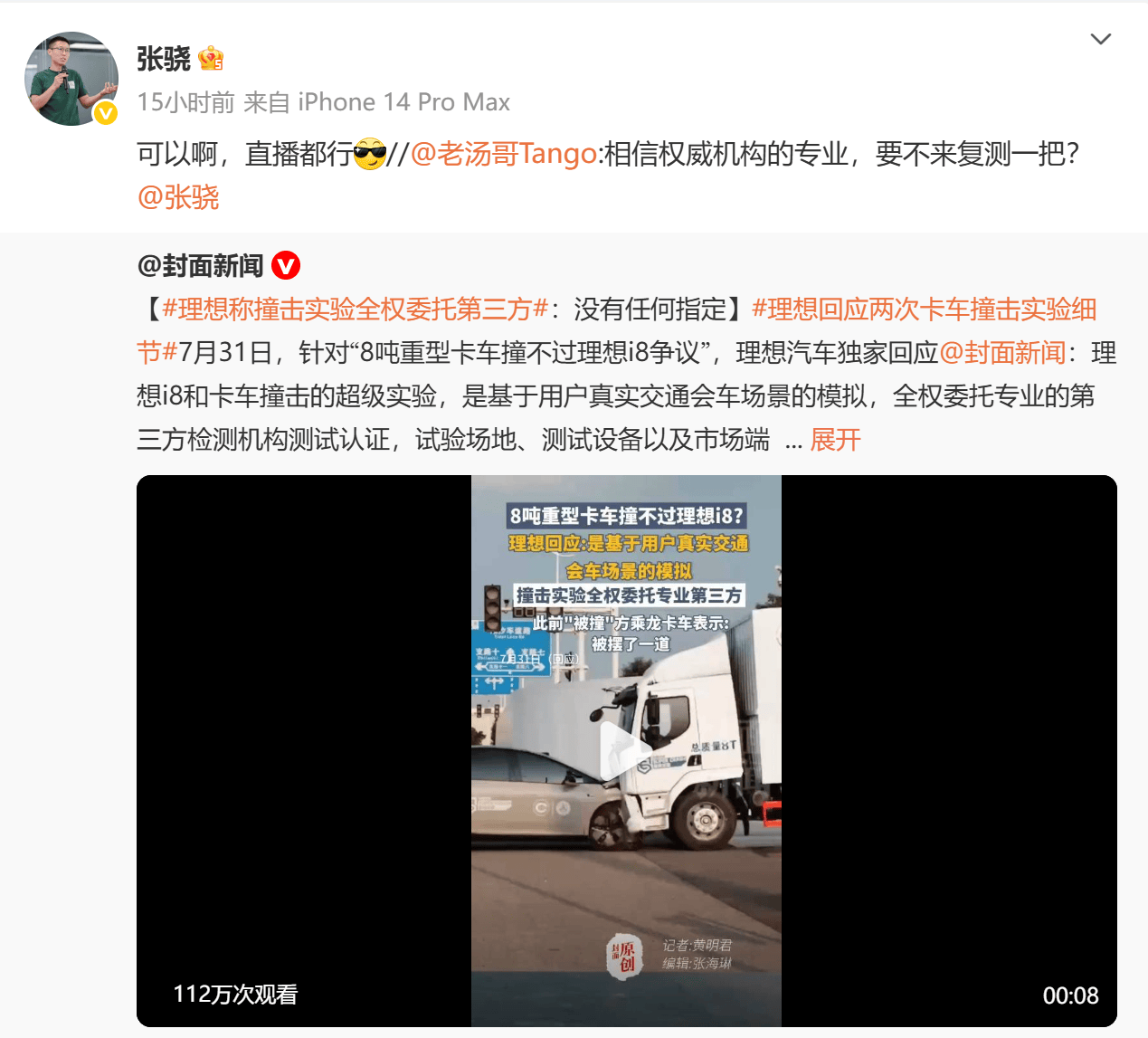 相关资料显示,理想i8本身已通过C-NCAP、C-IASI等权威认证,但这些标准化测试缺乏视觉冲击力。而与卡车的对撞因画面冲击力强,更能让观众看得过瘾。显然,原本应该更严谨的安全测试,已经被理想汽车当作了一种营销噱头。