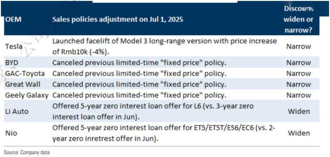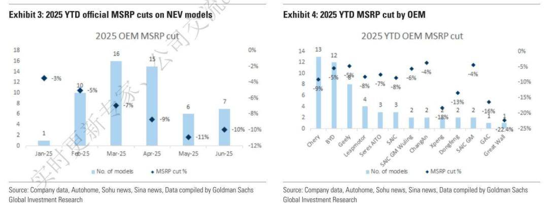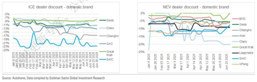 2025年上半年,高盛观察到有55次降价,平均降幅8%(2024年上半年为75次降价,平均降幅8%)。此外,经销商折扣也在扩大,与年初相比,传统燃油车、新能源汽车经销商平均折扣分别扩大2.4%、0.9%。