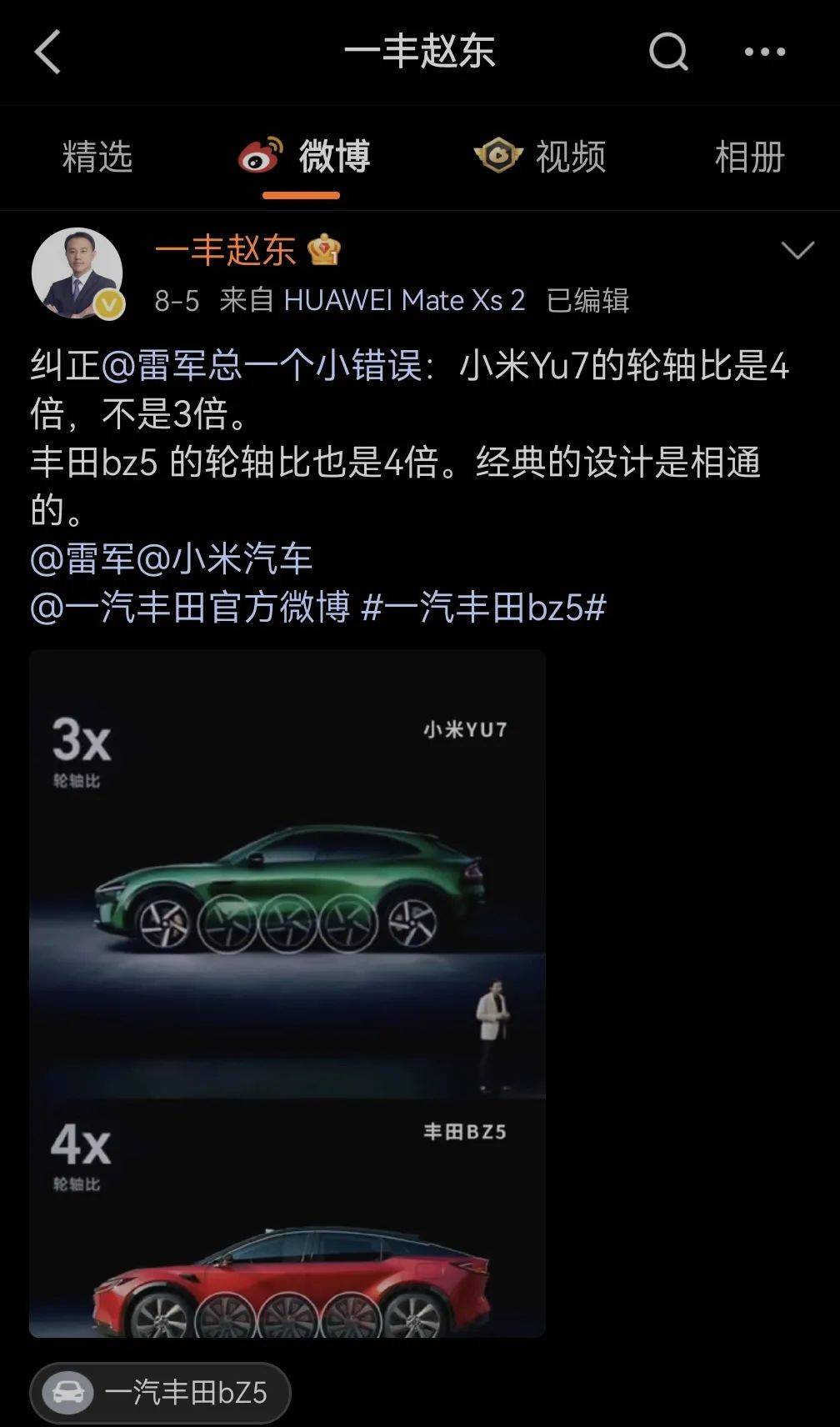 结果8 月 12 日,一汽丰田汽车销售有限公司企划部部长赵东在微博上发文,说从小米官方的 PPT 来看,小米 YU7 前后轮之间能塞进 3 个轮胎,那轴距和轮胎直径的比例应该是 4 才对,不是 3。