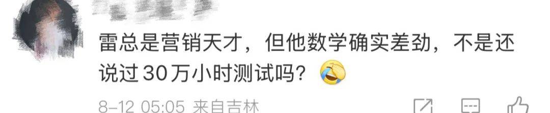 雷总是营销天才,但他数学确实差劲,不是还说过30万小时测试吗?