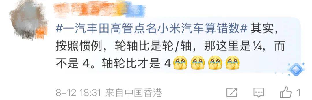 他还吐槽有些企业跟着小米学,也说自己车轮轴比是3 倍,可实际上小米自己都算错了。