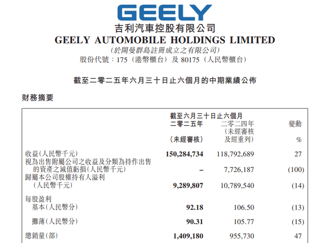 8月14日,吉利汽车控股有限公司(简称“吉利汽车”)发布的2025年中期业绩报告显示:2025年上半年,吉利汽车总收入达到1503亿元,同比增长27%,创历史新高;核心归母利润为66.6亿元,同比增长102%;市占率首次突破10%,达到10.4%。毛利总额提升至247亿元,毛利率达16.4%;总现金水平稳步上升至588亿元。