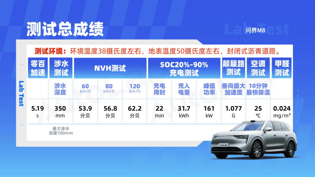 而纵观问界M8在我们LAB测试的表现也非常有意思,我们在动态、静态等方面对问界M8进行了8项硬核测试,所有测试项目问界M8的成绩均很出色。