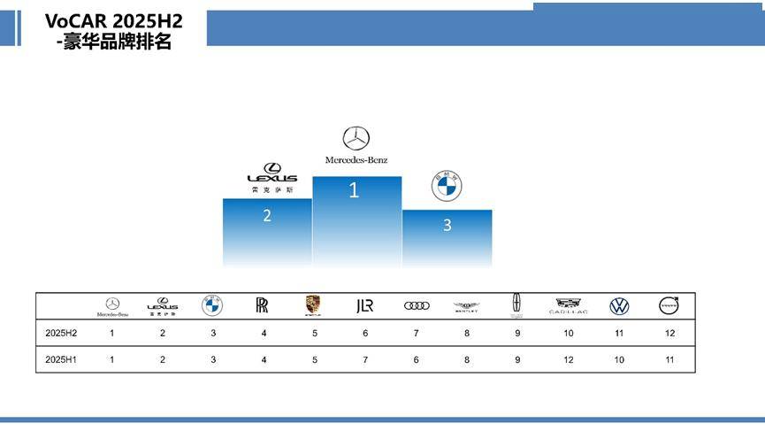 在豪华品牌细分赛道,奔驰再次问鼎2025 下半年度榜首,实现四连冠;雷克萨斯与宝马分列二、三位。捷豹路虎名次上升一位至第六,奥迪则滑落至第七;凯迪拉克连升两级,跻身前十。