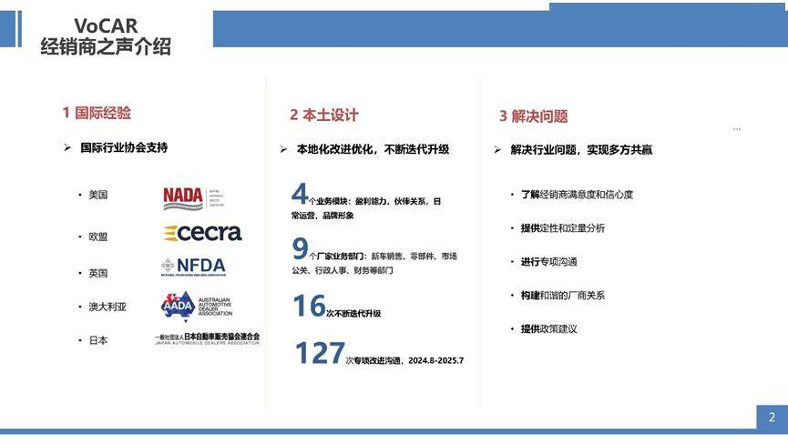 作为对标国际汽车流通协会的专业调研,经销商之声调研体系历经多次方法论优化与流程迭代。我们致力于通过这项行业研究:一方面推动汽车品牌持续完善经销商诉求响应机制,实现管理效能的渐进式提升;另一方面促进厂商支持政策的体系化建设,为经销商渠道健康发展提供系统性保障。