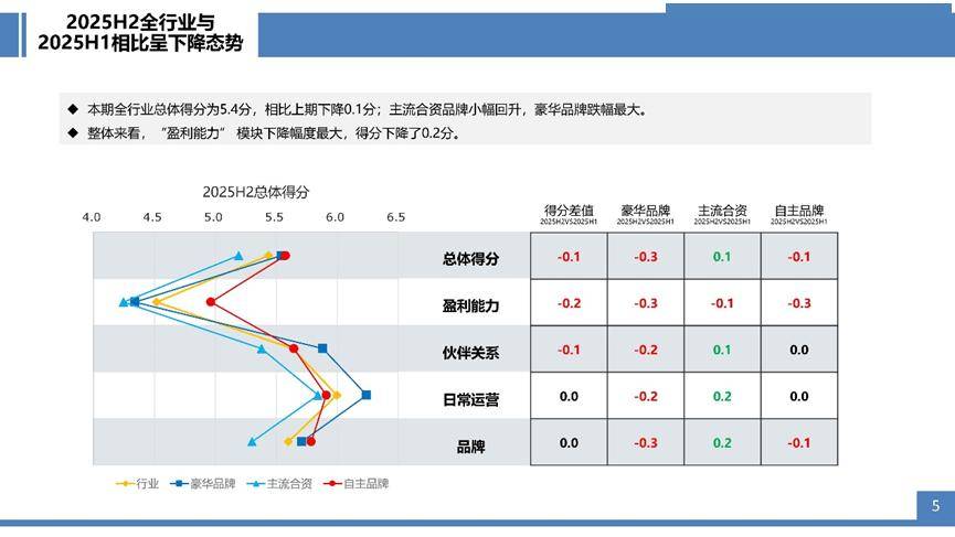 经销商之声2025下半年(H2)夏季版调研显示,行业综合得分为5.4分,自2022年下半年(H2)以来已连续7期下滑。相较2025上半年(H1),全行业得分下降0.1分,豪华品牌、自主品牌得分均有所回落,分别降低了0.3分和0.1分;主流合资品牌则实现小幅回升(0.1分)。