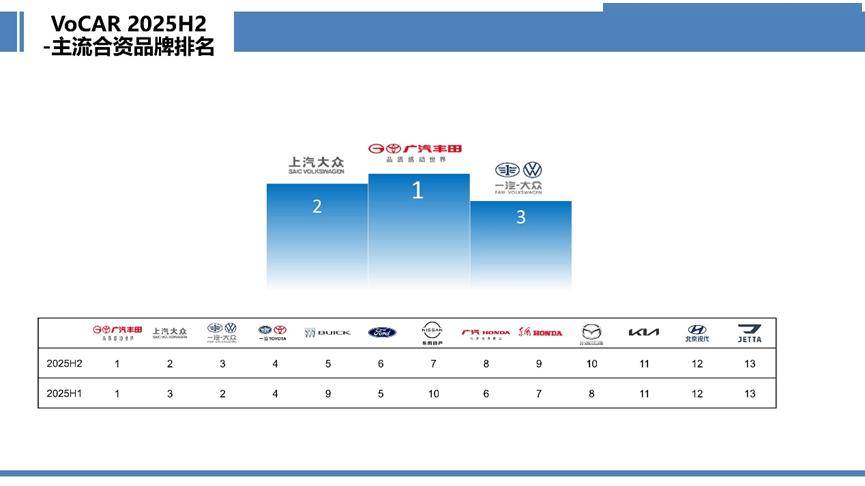 主流合资阵营,广汽丰田凭硬核产品矩阵、精准营销与全周期服务体系,再度问鼎;上汽大众、一汽-大众紧随其后,分列二三。一汽丰田则凭借精细化运营与经销商生态共治,稳居第四。尽管本期合资品牌综合得分环比微升,却仍低于行业平均线,复苏势头尚显脆弱。