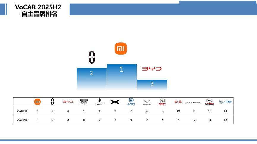 2025年,自主品牌凭借硬核产品力脱颖而出,综合得分首次超越豪华品牌,登顶三大细分市场。小米汽车、AITO、比亚迪延续“全科优秀”表现,稳居前三;吉利连升两级至第四;零跑品牌则以销量突围,首度跻身“经销商之声”榜单。