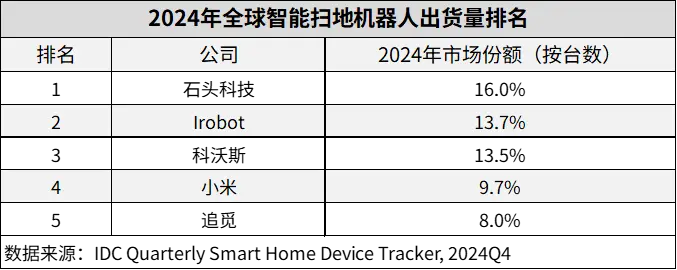 IDC数据显示,2024年,追觅全在全球扫地机器人的市场份额约为8%,排名第五。排在前面的四家企业中,有三家是中国企业。分别为:石头科技(约16%)、科沃斯(13.5%)、小米(9.7%)。