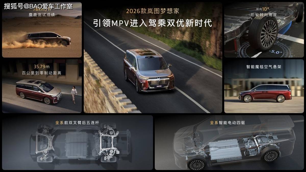 传统MPV给人的固有印象多是“车身庞大、操控笨重”,但2026款岚图梦想家的底盘技术打破了这一偏见。作为全球首搭智能后轮转向技术的MPV,其双向10度的后轮转向角度,让5.3米的车身拥有了堪比紧凑型轿车的转弯半径,首创的“蟹行模式”更是能轻松避开狭窄路况中的障碍物。即便是在老城区狭窄胡同里掉头,也无需多次调整方向;而前双叉臂后五连杆悬架、智能魔毯空气悬架与智能电动四驱的组合,让车辆在颠簸路面上的滤震效果远超预期。更硬核的是实测数据:麋鹿测试成绩高达78km/h;百公里制动距离仅35.79m。这种“大车气派+小车灵活”的驾控体验,重塑了市场对MPV的操控认知。