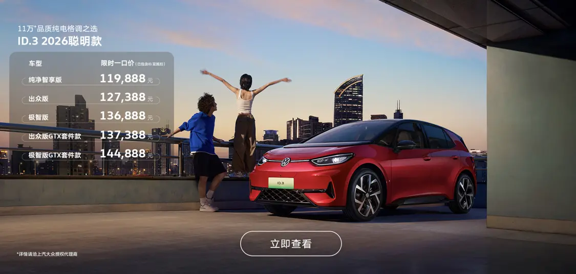9 月 19 日消息,上汽大众宣布旗下 2026 款上汽大众 ID.3 聪明款上市,新车定位年度改款,CLTC 续航里程为 451 公里,官方指导价为 12.9888 万元起,限时一口价为 11.9888 万元起。