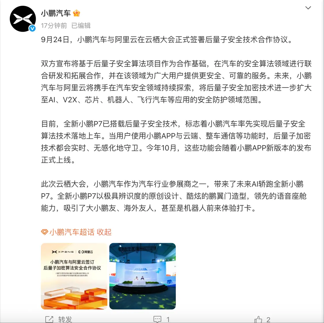 9月25日,小鹏汽车与阿里云在云栖大会正式签署后量子安全技术合作协议。双方宣布将基于后量子安全算法项目作为合作基础,在汽车的安全算法领域进行联合研发和拓展合作,并在该领域为广大用户提供更安全、可靠的服务。未来,小鹏汽车与阿里云将携手在汽车安全领域持续探索,将后量子安全加密技术进一步扩大至AI、V2X、芯片、机器人、飞行汽车等应用的安全防护领域范围。