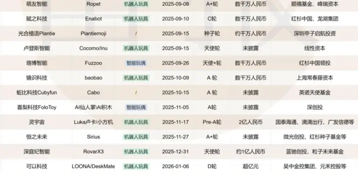 资本市场也用真金白银为这场浪潮投下了信任票。据不完全统计,自2024年至今,国内机器人玩具赛道已至少有52起投融资事件,其中2025年占33起,同比增加了83%。