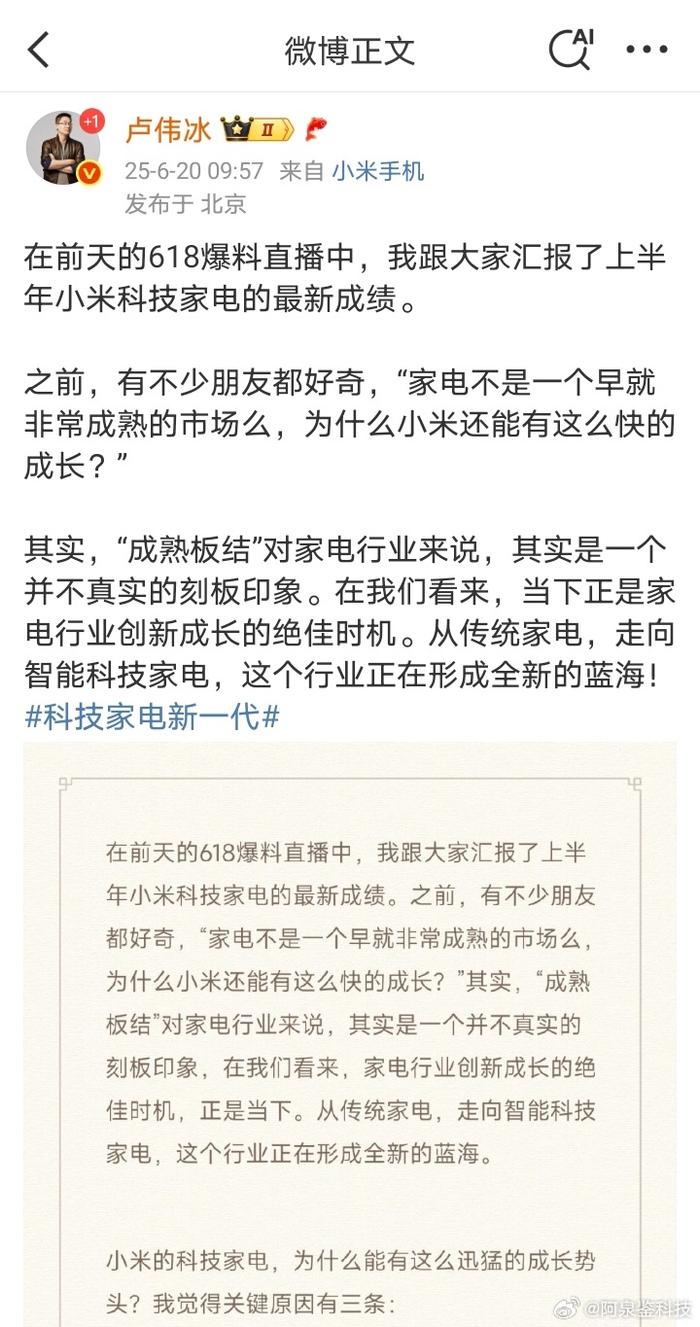 #小米科技家电# 小米总经理卢伟冰今日在微博发长文,谈到了当前的家电行业,指出当下正是家电行业创新成长的绝佳时机。在我看来小米品牌已经打响了,下一步打磨一下质量吧,小米家电业务还有很大的进步空间[吃瓜]#科技风向标#