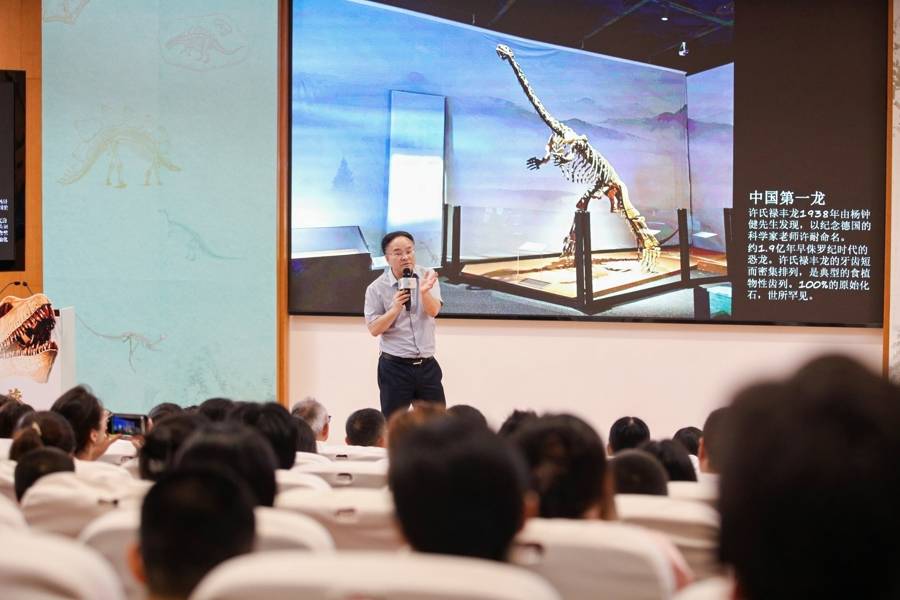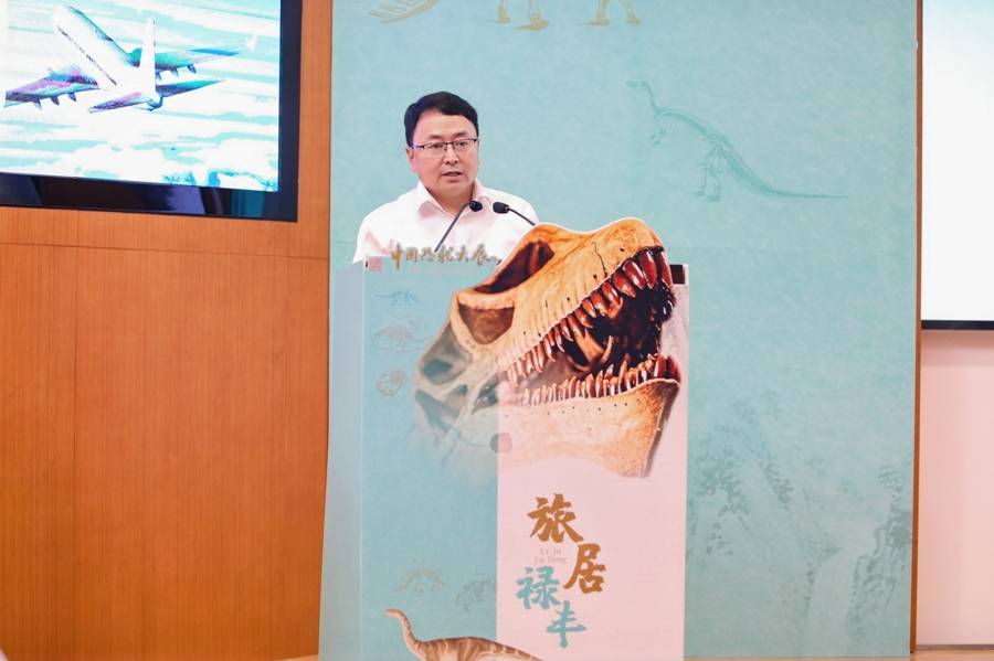 上海科技馆馆长倪闽景解读“龙吟九州·中国恐龙大展”上的禄丰标志性展品。