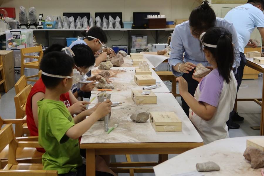 化石修复互动课现场,禄丰世界恐龙谷的工作人员教小朋友如何修复恐龙化石。(刘琦/摄)