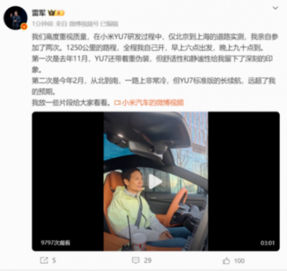 小米集团创始人、董事长兼CEO雷军今日在微博发文称,小米高度重视质量,在小米YU7研发过程中,仅北京到上海的道路实测,自己参加了两次。1250公里的路程,全程自己开,早上六点出发,晚上九十点到。“第一次是去年11月,YU7还带着重伪装,但舒适性和静谧性给我留下了深刻的印象。第二次是今年2月,从北到南,一路上非常冷,但YU7标准版的长续航,远超了我的预期。”
