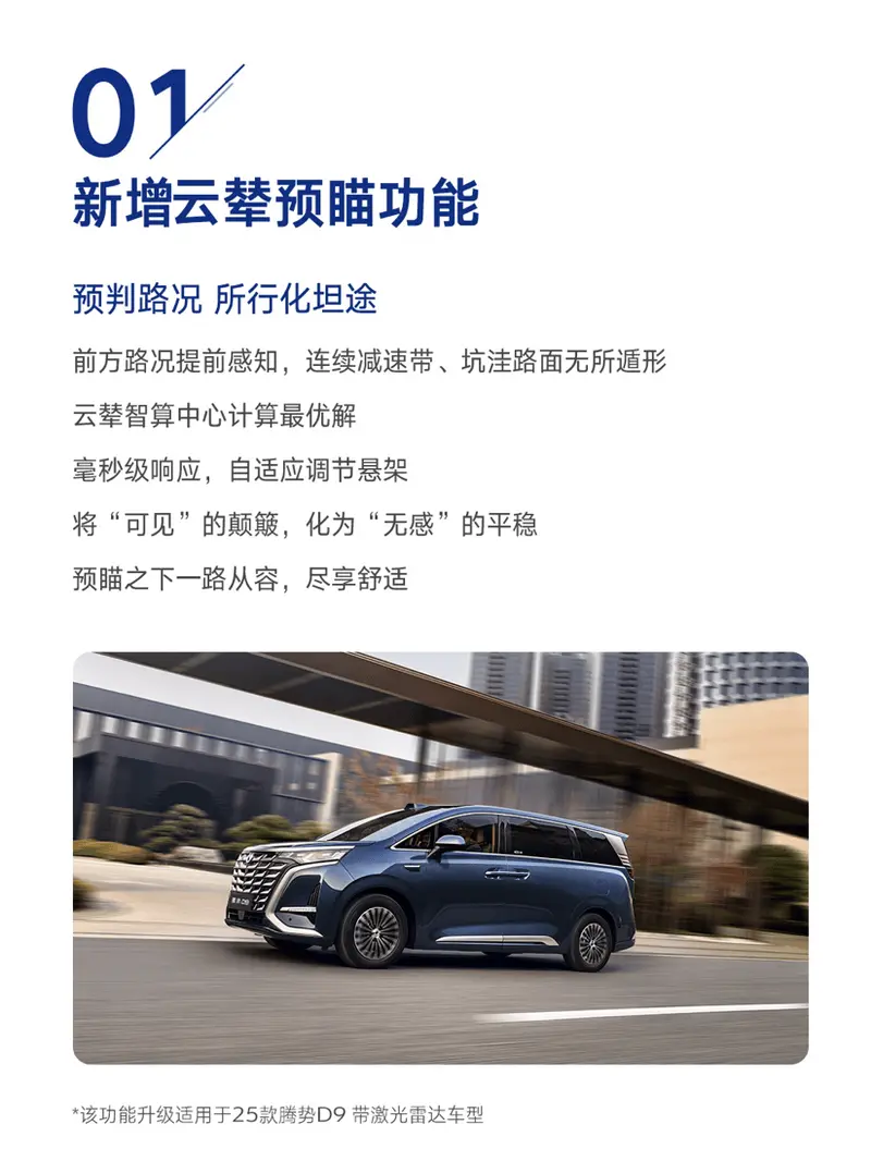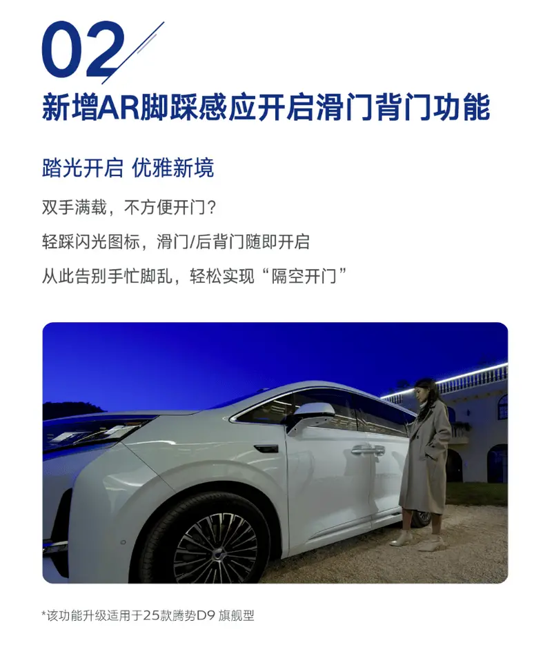 6月30日,腾势品牌官方宣布,25款腾势D9迎来重磅OTA升级,新增云辇预瞄、AR脚踩感应开启滑门背门、无麦K歌等多项功能,并对多项功能进行优化,实现整车智能的再进化。