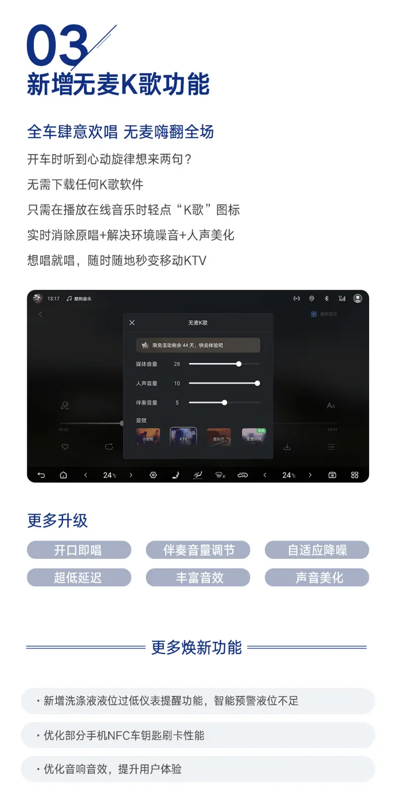 在驾乘舒适性上,云辇-C智能阻尼车身控制系统配合新增的云辇预瞄功能,可以提前感知前方减速带、坑洼等路况,毫秒级自适应调节悬架,有效化解颠簸。新增的AR脚踩感应开启滑门背门功能,轻踩地面投射的闪光图标,即可优雅开启滑门或后背门,从此告别手忙脚乱。此次新增的无麦K歌功能,依托行业领先的帝瓦雷剧院级声场,无需麦克风,让座舱秒变移动KTV,随时随地开启K歌模式。