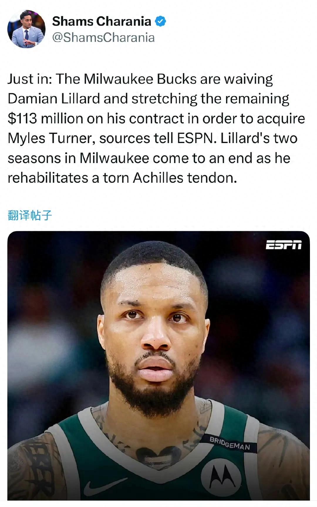 Shams报道:雄鹿将裁掉利拉德,并将他合同中剩余的1.13亿美元进行延展,以便腾出空间签下迈尔-特纳。
