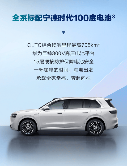 电驱与电池方面,全系标配华为高压七合一电驱和 800V 巨鲸高压电池平台,CLTC 续航最高达 705km。800V 平台的优势不仅在于续航,更在于补能效率,一杯咖啡的时间(约 15 分钟)就能充至 80%,彻底告别续航焦虑。宁德时代 100 度电池的加持,加上华为的 BMS 电池管理系统,安全性和耐久性都有保障。这种技术组合,让纯电版在性能和实用性上达到了完美平衡。