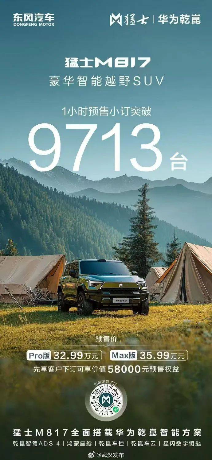 7月17日,东风豪华电动越野品牌猛士第二款产品——猛士M817技术发布并开启预售。这款整合东风全栈越野技术积淀与华为智能解决方案的新车,首搭华为乾崑智驾ADS 4.0,预售1小时小订达到9713辆;而5天前,行业首搭华为乾崑智驾ADS4与鸿蒙座舱的岚图FREE+正式上市,15分钟内大定锁单1.15万辆,成为继岚图梦想家之后,东风高端新能源矩阵的又一标杆。