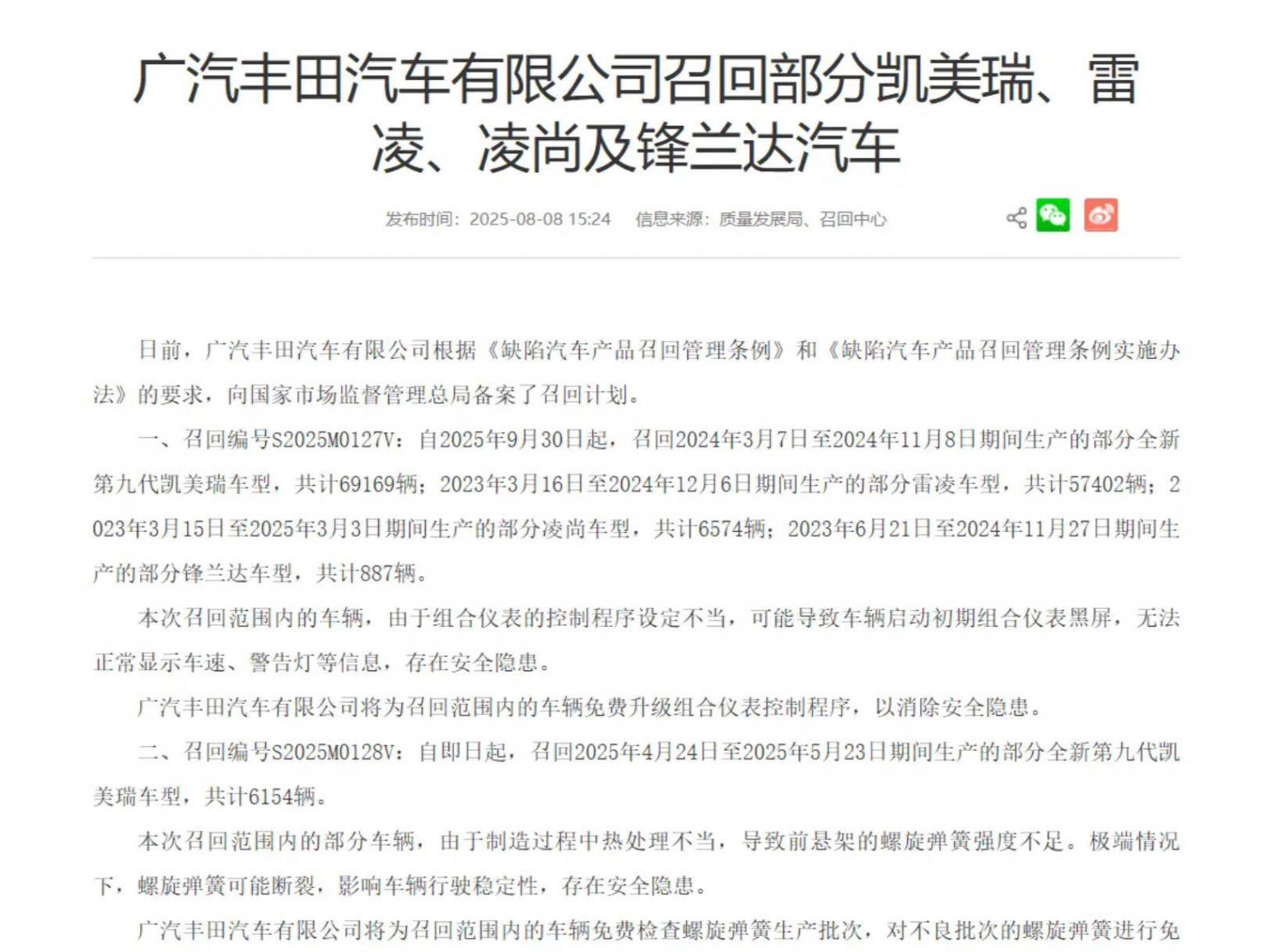 其中第一项 召回9 月 30 日起实施,涉及第九代凯美瑞、雷凌、凌尚、锋兰达等车型共计13万余辆,因组合仪表程序缺陷,启动初期可能黑屏,将免费升级程序;第二项 8 月 8 日已生效,6154 辆凯美瑞因前悬架弹簧热处理不当强度不足,将免费检查更换(详见配图)。