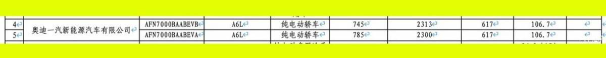 最后我们来说动力,也是这台车最硬核的地方。据曝光的工信部申报信息显示,一汽奥迪A6L e-tron将搭载容量为106.7千瓦时的大电池包,动力电池总质量为617公斤,电池类型为三元锂电池,供应商是宁德时代。纯电续航里程根据不同版本有745公里、785公里两种。