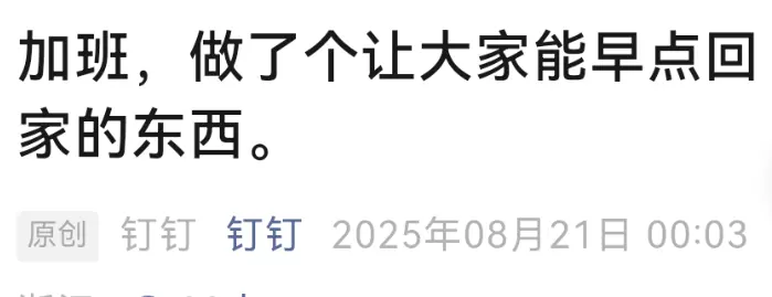 然而,钉钉似乎并未试图淡化这类争议,反而像是在“自我调侃”的道路上越走越远。其官方公众号在相关事件引发关注后,发布了一篇题为《加班,做了个让大家能早点回家的东西》的文章,仿佛将“加班”作为一个轻巧的梗来消费。