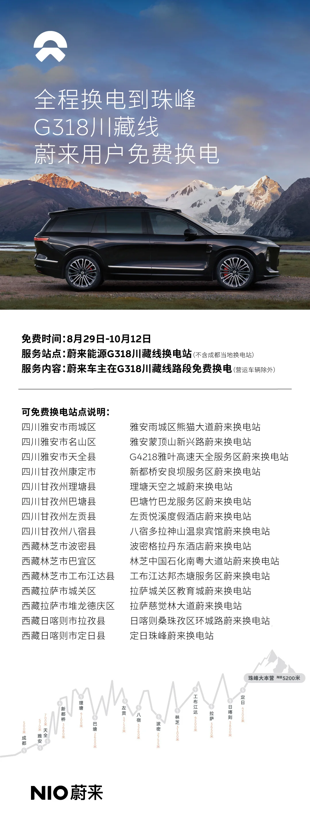 8 月 28 日消息,蔚来汽车今日宣布,2025 年 8 月 29 日至 10 月 12 日,G318 川藏换电路线将向蔚来、乐道用户提供不限次数免费换电服务,让更多的用户无忧抵达远方。