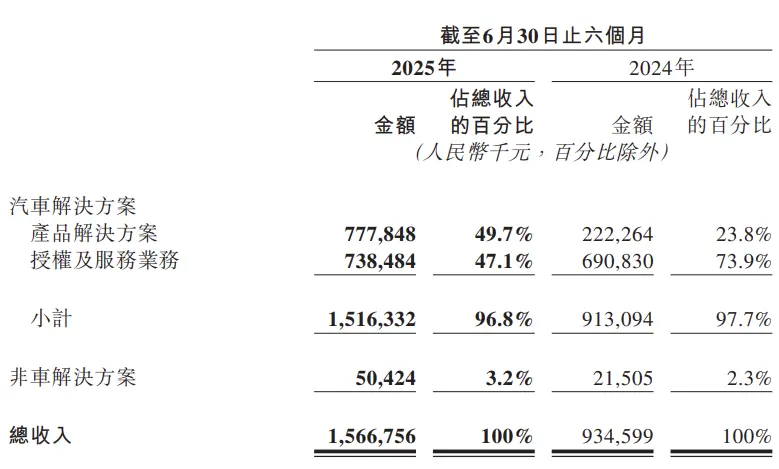 财务数据显示,地平线产品解决方案业务收入7.78亿元,为去年同期收入的3.5倍,占总收入的49.7%;授权和服务业务收入7.38亿元,同比增长6.9%,占总收入的47.7%。地平线的业务结构和营收比例,从去年的1:3变成了对半开的局面。