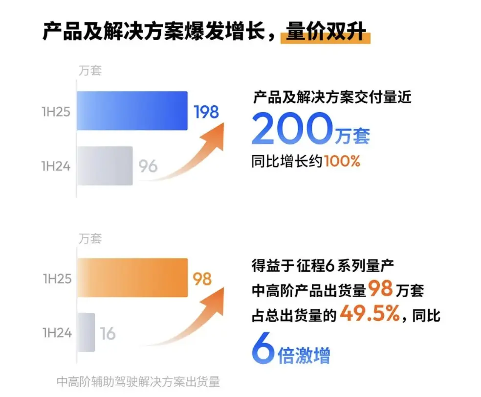 销售数据显示,2025年上半年,地平线的产品解决方案业务总出货量为198万套,同比实现翻倍增长。得益于征程6系列的量产,地平线中高阶产品解决方案出货98万套,较去年同期激增6倍,并占总出货量的49.5%,合计贡献了产品及解决方案业务超过80%的收入。综合下来,地平线因中高阶产品解决方案交付比例提升,单车价值量大幅提升至去年同期的1.7倍,进而使得整体产品解决方案业务实现“量价齐升”。