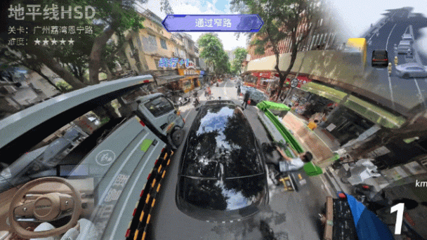 在道路相对没那么拥挤的路段,例如在广州荔湾恩宁路段。该路段虽然是单行线,但路上存在大量电动两轮车。在这种路况下,HSD基本能保持在10km/H以上的行驶速度,车开得“一点都不怂”。在面对两轮电动车的占道博弈时,HSD会选择优先礼让对方决策,等待两秒后,HSD立马直接绕行。