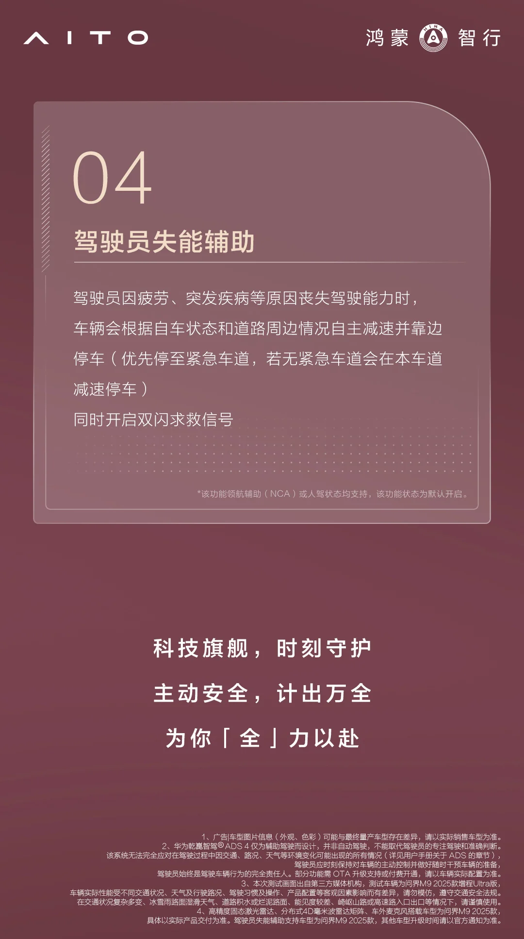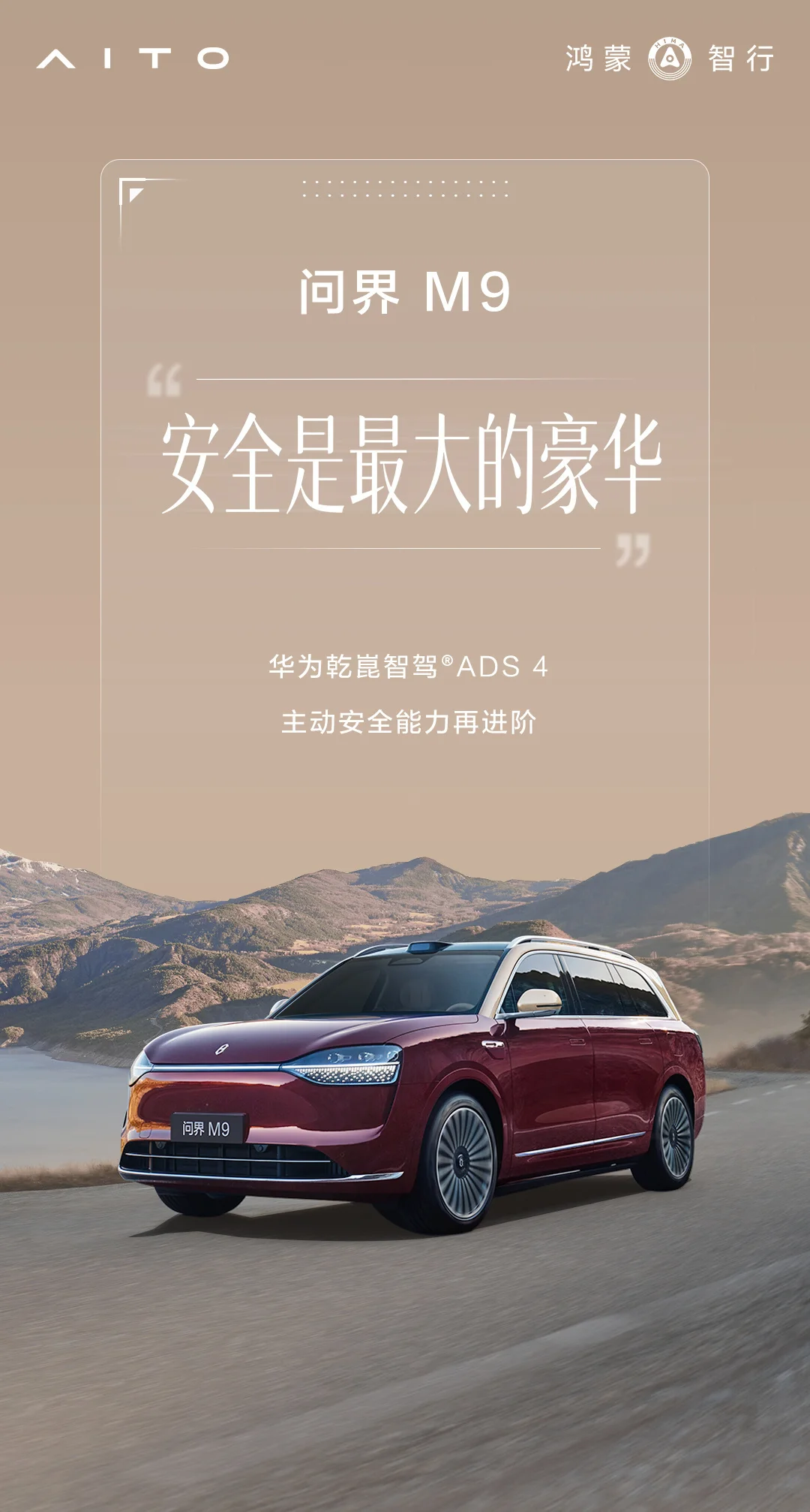9 月 25 日消息,今天下午,鸿蒙智行官微宣布,问界 M9 全系开启华为乾崑智驾 ADS 4 升级,主动安全能力升级了增强型自动紧急转向、前向雨雾天气 AEB、侧向 / 后向安全 AEB、驾驶员失能辅助四项特性。
